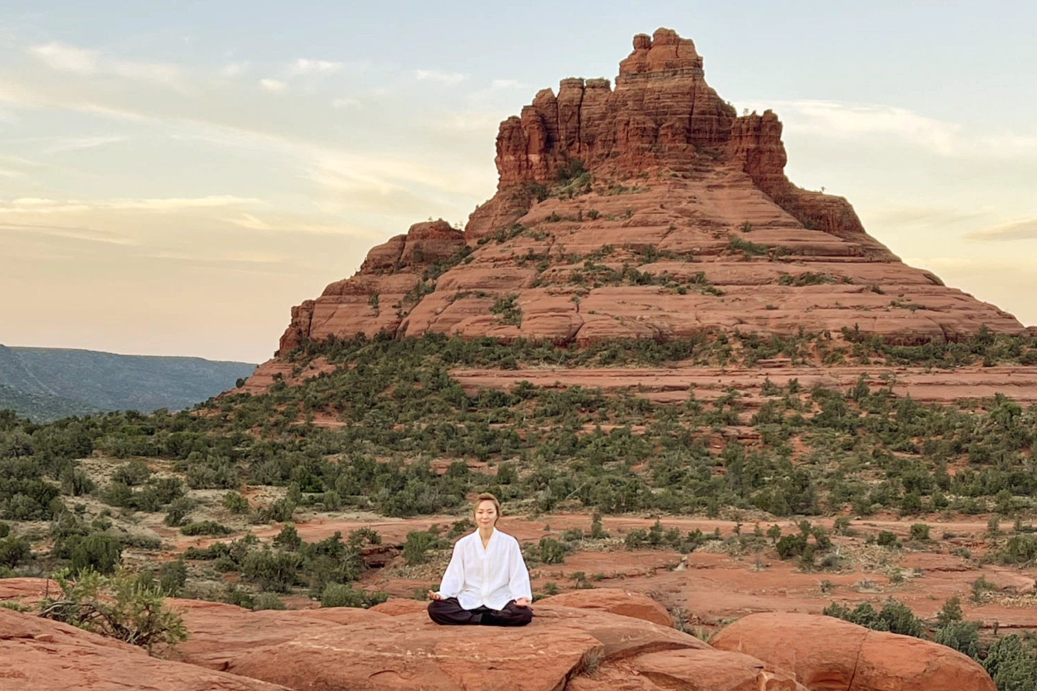 Over four nights and five days, guests stay in a private room with shared bath and enter a daily rhythm of morning meditation, Tao breathing practice, Tao yoga, and qigong cultivation. Guided hikes through Sedona’s red rocks and outdoor meditation at natural sacred sites are woven into the experience.